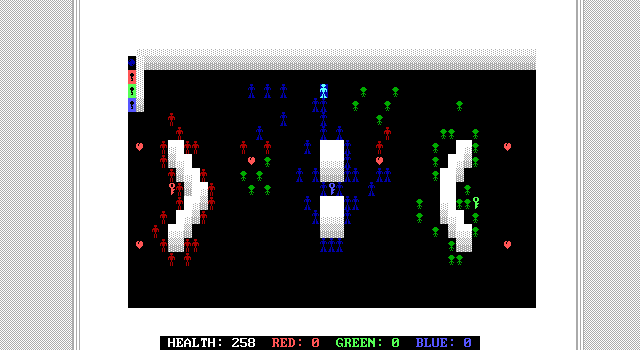 Of course, due to it being converted from ZZT instead of being completely remade, you can't expect the greatest graphics for a MegaZeux game. The title screen is nice though. If only I knew what it's supposed to be.