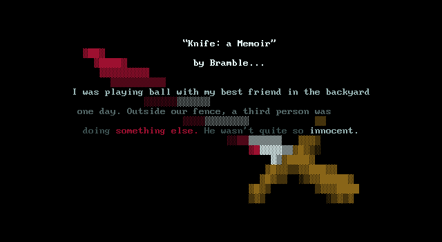 This game feels a lot like angsty Japenese literature. And this is great if that's what you're in the mood for. A typical Bramble-format game: story driven, well written, ~30 minutes, beautiful but minimal art. Better than most MZX games, and probably worth a play.