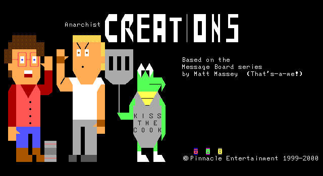 This is a project dump of the original version of Anarchist Creations, started by Anerki and primarily worked on between 1999 and 2001 by Anerki and myself. It was based on Anerki's series of short stories by the same name that he posted on the Mog's Realm roleplaying forum on AOL. As such, there are many in-jokes from back then that will not make sense to the modern spectator.