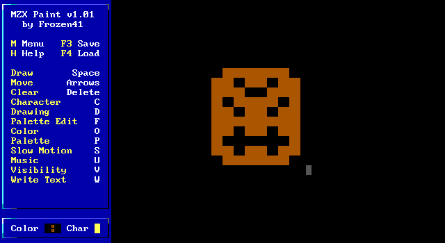 Here's another "Hey, Look What I Can Do" title - this time it's a simple paint program that allows you to not only place whatever chars you want on the 80x25 board, it also has a palette editor and a charset loader. But all things considered, the MZX editor is better for this sort of thing, especially since this program doesn't support SMZX mode.