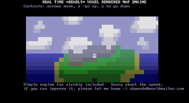 3) This is just a heightmap renderer, not a voxel engine, and it's not a very good one at that. Mountains suddenly disappear at the screen boundaries and aren't cleared from the horizon when the player moves horizontally.