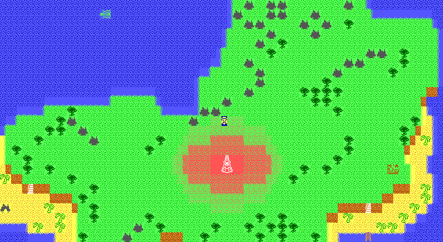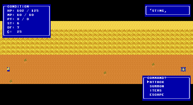 The programming is pretty shoddy here. Interaction with people and chests involves use of a Dragon Quest style menu that you open by pressing Delete (which, by the way, the game doesn't tell you). The input on all the menus is very delayed, and it's easy to accidentally hold or hit Space again and accidentally use the wrong item or skip a dialogue box. It's even possible to get into a random encounter while you're accessing the menu, since they're based on how many arrow key presses you've made rather than actual steps taken. To be fair, though, that last part was par for the course for MZX RPGs at the time.