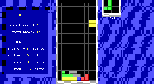 A decent tetris clone. It doesn't have anything special but, hey, it's TETRIS in MZX! There's one song that's simply a remix of the tetris theme with a hip hop twist. The palette changes per level. Some of tha palette's are hard/impossible to see without adjusting the monitor. Graphics were okay, on par with TetrisAk just not SMZX but akes up for it with some nice blends and smart charactor editing. The gameplay is classic Tetris. The levels progress well, this game can be played for a while.