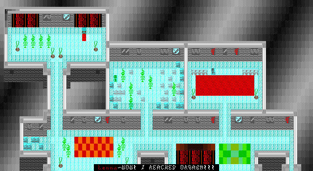 Gameplay-- at least, most of the gameplay (I'll get to the boss fights in a moment) is most kindly described as 'default.' You fight a relatively small range of built-in enemies with unlimited built-in bullets- they aren't even a particularly challenging selection or used in an interesting way (see: Fallen) so these enemies essentially amount as nondescript things that get in your way as you clear through the levels. This is not necessarily that much of a BAD thing- if shooting built-ins was so horrible we'd never get through Forest of Ruin and you can certainly do far worse (taking away the default bullets and giving the player a horrid sword engine after the first third, for example- see: Blade of Islan) - it doesn't exactly make for engaging gameplay, though- with one exception, Satan's Lab, which features the most dreaded built-in MZX has to offer; the invulnerable ghost. Eek. On the whole though levels just feel like a chore you have to get through. Rather than healing up through pickups, you can use healing items you've previously acquired through treasure chests scattered throughout the levels and by buying from shops in towns. Each town has an NPC that will exchange score for coins, giving a good reason to hunt down those built-ins because the items can be quite essential.